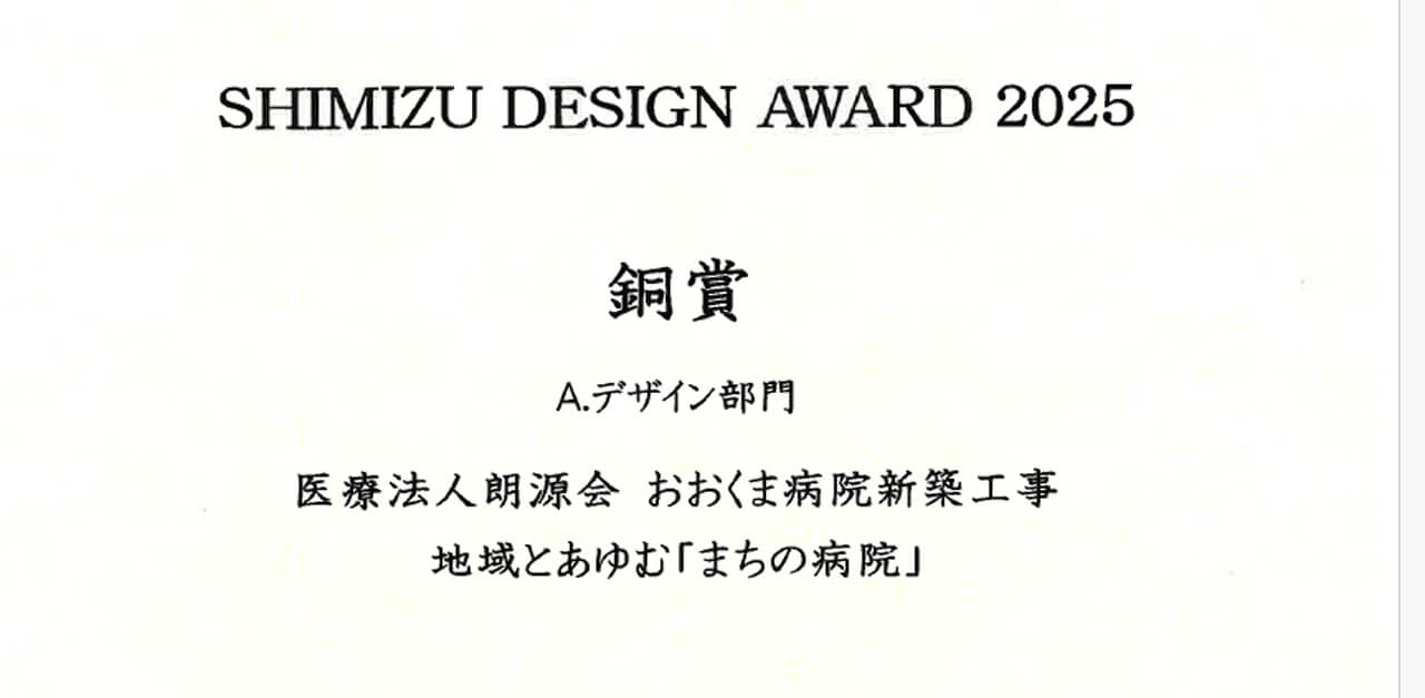 当院を担当された設計チームが、清水建設設計部門のSHIMIZU DESIGN AWARD 2025で、デザイン部門の銅賞を受賞されました。
